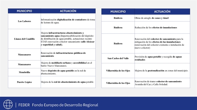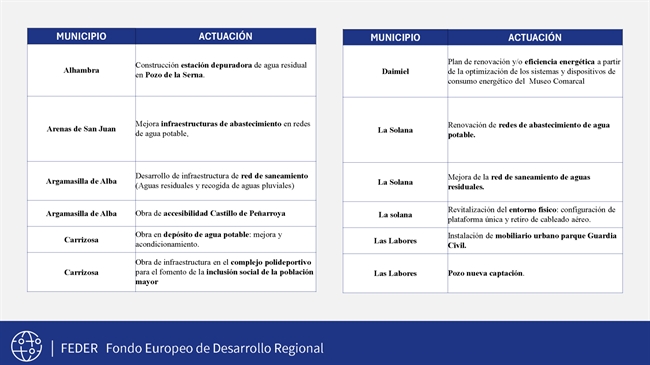 Gracias a la colaboración del GDR Alto Guadiana Mancha con la Diputación y los ayuntamientos, se desarrollarán 29 actuaciones que beneficiarán directamente a municipios como Villarta de San Juan, Puerto Lápice, Arenas de San Juan, Manzanares, Argamasilla de Alba, La Solana, Villarrubia de los Ojos, Membrilla, Alhambra y Carrizosa, entre otros.